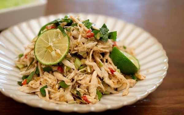 4.將雞肉和全部配料放入大碗中,擠入一個檸檬汁,適量醬油和鹽拌勻。裝盤開吃。