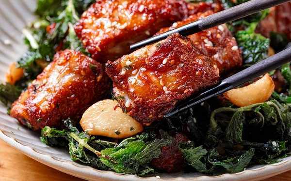 荷在熱油裡釋放出清涼香氣,巧妙化解瞭油膩,排骨更為鮮嫩清爽,同時復炸過的薄荷葉,像海苔一樣酥脆。