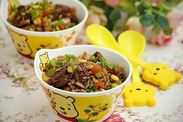 7、加入胡蘿卜丁和玉米粒大火翻炒1分鐘;