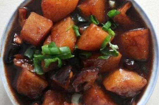 2.將適量的油及其他油倒入火鍋中,加熱至中火,再將土豆倒入平底鍋炒,再加入一湯匙海鮮醬及適量的老抽,同時加水,不超過香菇汁的水位,加入少許冰糖、鹽、開水,慢慢煮至盛汁,碟後撒上少許洋蔥。