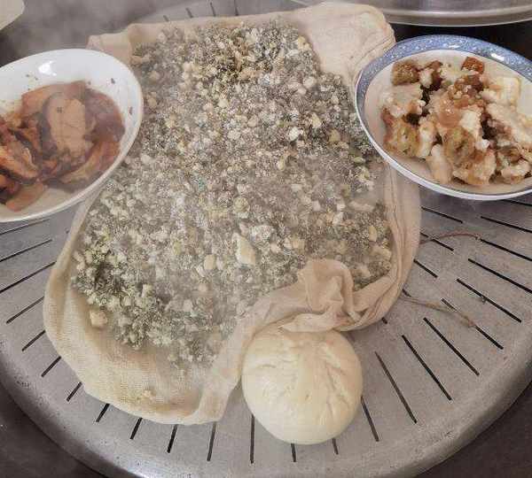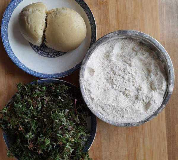 原料:白蒿、饅頭、面粉、大蔥、花椒粉、鹽、雞精、油、碘面。
