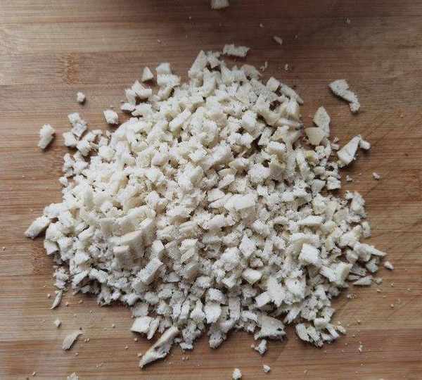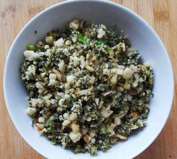 第4步、取一個盆子,將切好的白蒿末和饅頭小丁放進去,,裡面加少許面粉,碘面,鹽和胡椒粉攪拌均勻。