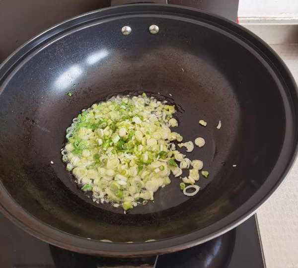 第8步、鍋中倒油,將切好的蔥花小火翻炒成金黃色關火。
