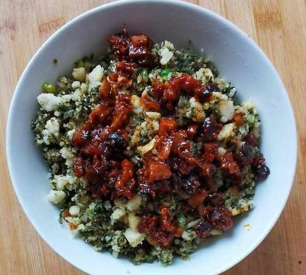 第9步、將蒸好的白蒿麥飯放進去攪拌均勻即可。