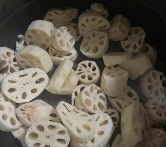 蓮藕洗好了,放入高壓鍋裏,加入適量的清水,先來煮10分鐘。