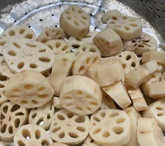 蓮藕選購時,最好是挑選圓滾滾、胖乎乎得那種,這樣的蓮藕才軟綿好吃。蓮藕削去表皮,把兩頭的蓮藕節削去,切成小塊,放入清水裏,浸泡時清洗乾淨,注意清洗蓮藕孔。