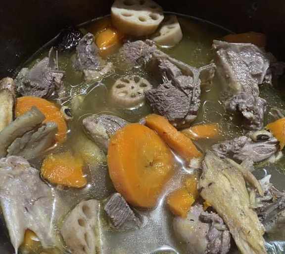 10分鐘後,排出氣體,打開鍋蓋,放入胡蘿蔔,輔佐食材,老鴨肉,白酒,蓋上鍋蓋,繼續燉煮30分鐘。時間到了,燜個10分鐘,再來排氣打開鍋蓋,香氣十足的鴨肉湯就做好了,這味道實在是太香了,把隔壁家的小孩都引來了。
