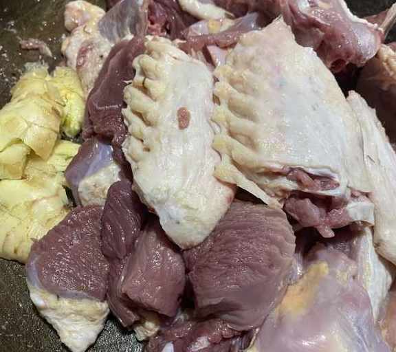 製作好的鴨肉湯,應當選用老鴨子,老鴨子洗乾淨血水,剁成塊狀,至於大小比平時炒得鴨肉大一點就好。順便也來弄一塊生薑,生薑拍扁就好。