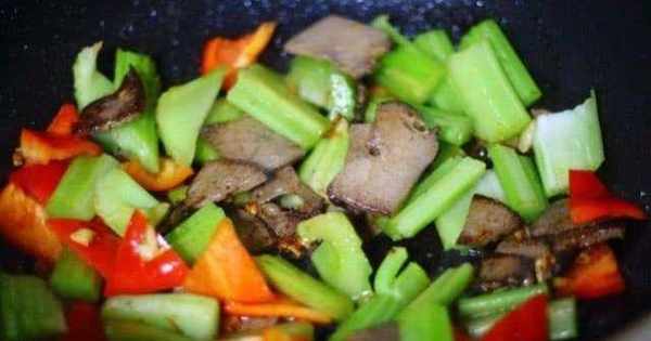而後將鍋進行燒熱,以此下入油,就可以猛火來燒熱瞭,然後下豬肝來煸炒,再加芹菜段,繼續炒一會兒,再加入鹽、胡椒分和生薑汁等炒勻,就可裝盤瞭。