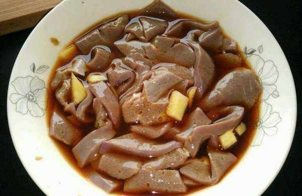 然後就需要將買回來的豬肝進行洗幹凈瞭,再將其切成3厘米厚的小塊,而後再用開水來將其焯一下,再加適量的生抽、酒、生粉、糖、生薑汁等醃料,將其醃漬浸泡一會兒。