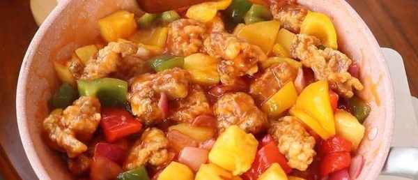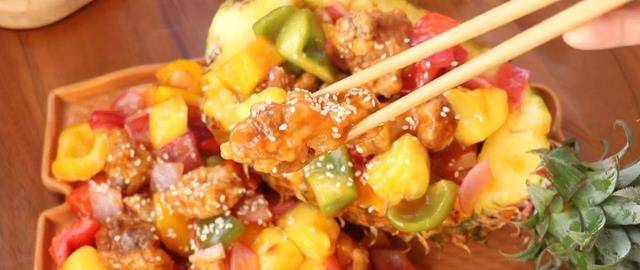 倒入糖醋汁後我們再翻炒一下,就可以倒入已經炸好的排骨和菠蘿啦