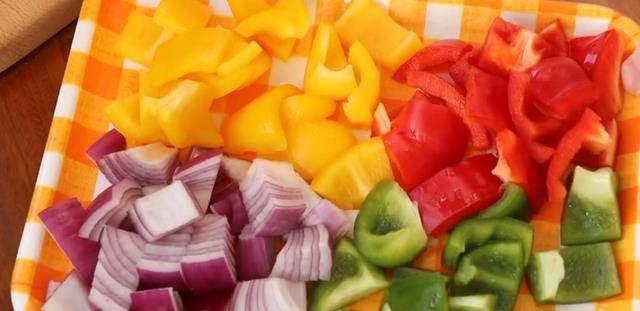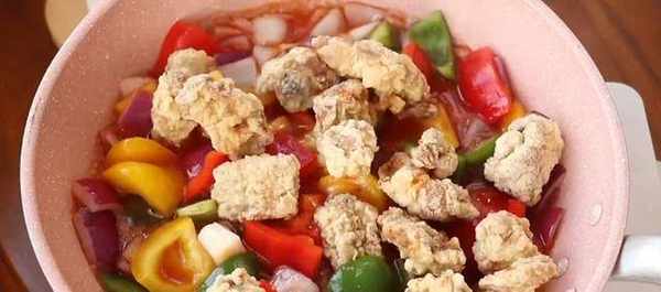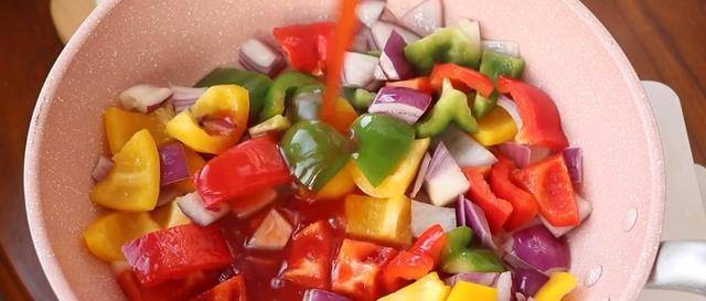 然後把我們準備的青紅黃辣椒和洋蔥倒入鍋中炒一下,然後加入一包糖醋汁