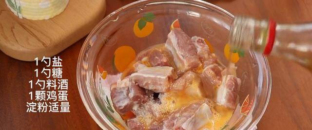 然後把我們清理好的排骨,放在碗裡加入1勺鹽、1勺糖、1勺料酒、1顆雞蛋、淀粉適量拌均勻,(排骨我們可以提前先準備好,讓排骨醃制一會兒這樣更入味)