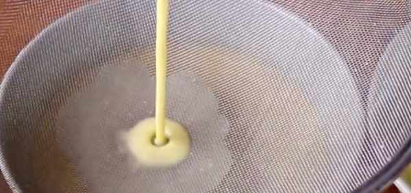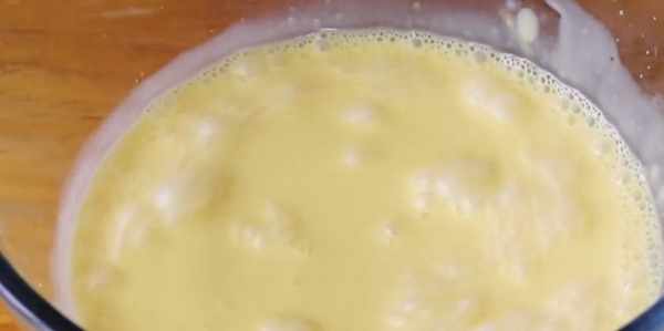 2.準備2個大點的碗,將雞蛋打入一個碗裏,然後把蛋黃用勺子舀出來裝入另外一個碗裏,我們這裡只需要蛋黃。先用筷子把雞蛋攪散,然後把晾凉的牛奶少量多次地加入蛋黃液裡面。一邊加一邊攪拌均勻,最後攪拌成顏色均勻一致的牛奶蛋黃液。最後再放入少許的白醋去腥,如果家裡有檸檬,擠入幾滴檸檬汁進去,口感會更好哦。繼續攪拌均勻,放一旁備用。