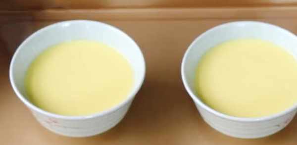 3.為了讓做出來的布丁口感更嫩滑,我們再把牛奶蛋黃液過濾兩遍。然後把它們分裝在兩個碗裏,撇去表面的浮沫。烤盤裡面裝入少許清水,用水浴法做出來的布丁,口感會更加嫩滑哦。然後把碗放入烤盤裡面,烤箱170度提前預熱10分鐘,再把烤盤放入提前預熱好的烤箱裡面,繼續170度,烤上30分鐘。因為每個人家裏的器具不一樣,一定要根據自己的實際情況來定時間長短。烤的時候隨時留意布丁表面,上色了,出現焦斑了就可以出爐了。
