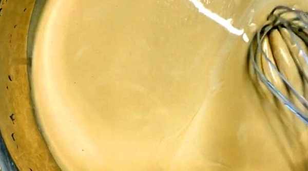 第二步:取一個大碗,加入大約200克的糯米粉,把攪拌化開的紅糖水倒進去,邊加邊攪拌,最後攪拌成無顆粒狀的糯米糊,糯米糊的狀態有點稀,不要和得太濃稠,否則吃起來太硬,放在一邊備用。