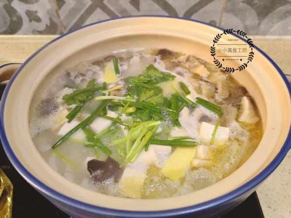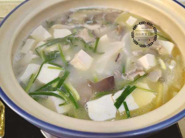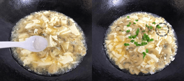 3、接著放入豆腐塊和蘑菇,小火熬煮10分鐘後加入薑片,蔥段,食鹽和白胡椒,攪拌均勻後即可關火。