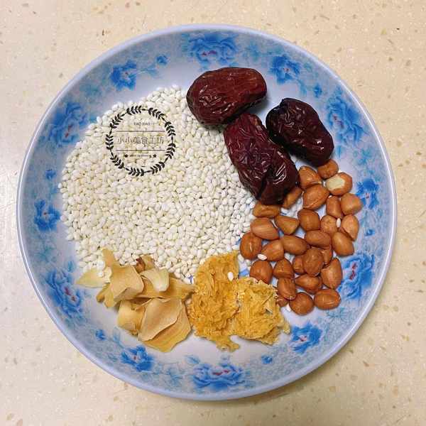 1、準備食材,紅棗,花生,百合,銀耳,糯米和紅糖,將百合和銀耳提前冷水泡發,其餘食材沖洗幹凈備用。