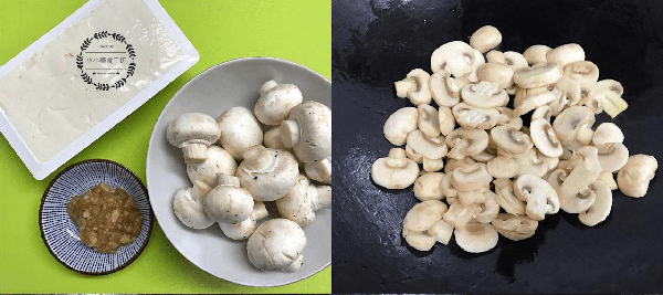 1、準備好豬肉末,內酯豆腐和蘑菇,將蘑菇切片放入油鍋中煸炒變軟後盛出。