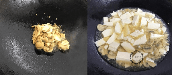 2、鍋中放入適量油,放入肉末炒制變色,然後放入炒好的蘑菇一同翻炒,最後加入熱水和豆腐轉大火燉煮。
