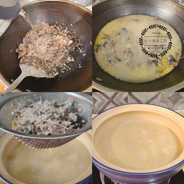 2、接著在鍋中倒入熱水,中大火煮至5-8分鐘左右,待魚湯奶白後用濾網過濾出雜質,將剩下的魚湯倒入砂鍋中。