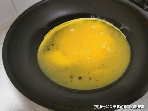 3、雞蛋打入碗中,加入食鹽攪拌均勻,鍋裡倒入油燒熱,倒入雞蛋液,小火煎成雞蛋皮,盛出後切成雞蛋絲。