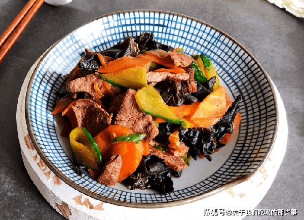 2、木耳提前泡發並洗幹凈,黃瓜、胡蘿卜洗幹凈,切成薄片,蔥薑蒜切末。起鍋燒油,放入醃好的豬肝片,中火翻炒至變色,淋入料酒去腥,盛出備用。