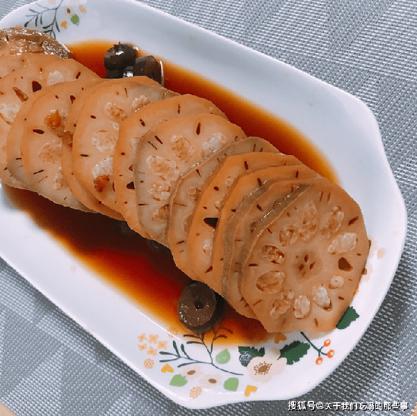 3、撈出煮熟的糯米藕,切成薄片放入盤中,澆上煮蓮藕的紅糖汁,即可食用。