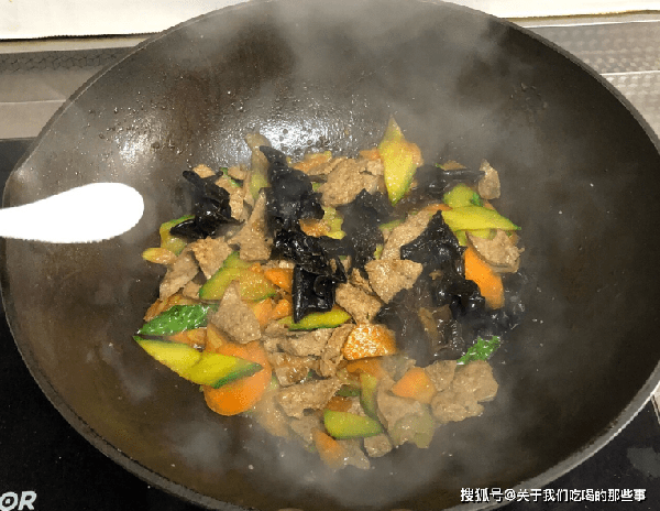 3、鍋裡留底油,下入蔥薑蒜爆香,倒入木耳、胡蘿卜翻炒一會兒,斷生後倒入黃瓜片,加入味極鮮、老抽、蠔油調味,翻炒均勻後加入豬肝,炒勻即可出鍋。
