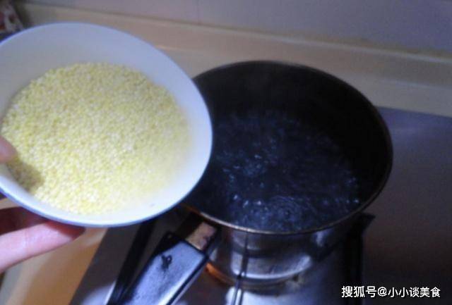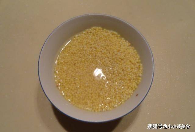第一步:首先,將小米洗凈。洗好後,準備一個碗,碗裡放冷水,把小米放在碗裡泡30分鐘左右,讓小米吸一些水,讓小米變軟。小米可以提前泡好,這樣可以節省更多的時間。