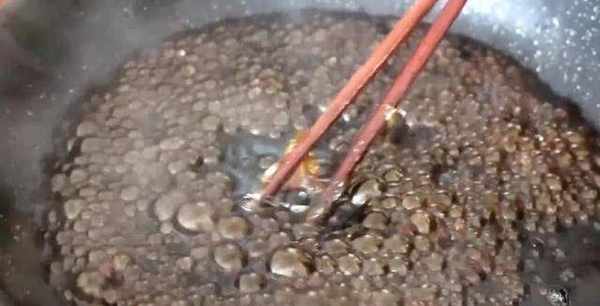 3.在無水無油的鍋裡面倒入適量的紅糖進去,再倒點清水進去,用鏟子不停的翻攪,將鍋裡面的紅糖不停的翻攪,將其攪拌至融化。待鍋中紅糖完全融化之後在裡面倒入適量的麥芽糖進去,繼續用筷子攪拌,將其攪拌融化。