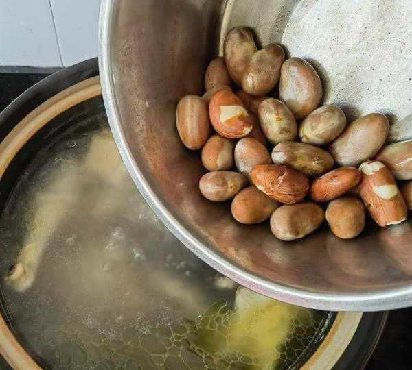 第2步、傢雞涼水下鍋,大火煮開,撈去浮沫,中火煮20分鐘。菠蘿蜜核,冷水下鍋,加點鹽,煮開後撈起過涼水,用刀去除外面薄薄的一層透明殼。將處理好的菠蘿蜜核倒入雞湯中,中火繼續煲20分鐘。