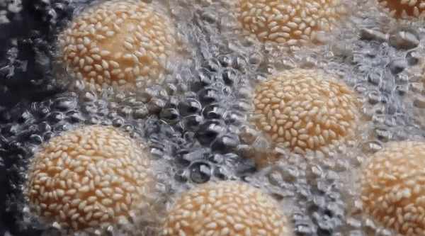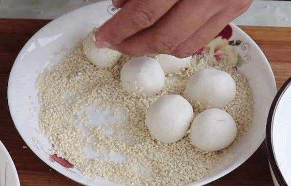 4.然後把每一小份搟成圓形,在盛有芝麻的碗中搟圓,芝麻球的底部就成型瞭。5、可以開始炒瞭。鍋中加入足量的食用油。需要更多來覆蓋芝麻球。稍微熱一點的時候,我們把芝麻球一個一個放進去。不能充分加熱時放入,否則容易粘鍋,裡面不容易熟。如果此時放入,油溫會慢慢升溫,芝麻球也會升溫。火候比較均勻,一定要小火煎。這樣做出來的麻球,直到麻球浮起來,才爆裂。6、然後用鍋鏟將漂浮的麻球推開。壓縮後,可以增加麻球的體積,制成空心麻球。