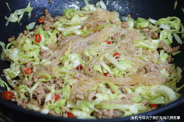 3、包菜絲斷生後,放入粉絲,加入生抽、老抽、蠔油,大火炒勻上色,最後加入炒好的雞蛋塊,加入適量鹽調味,炒勻後即可出鍋。