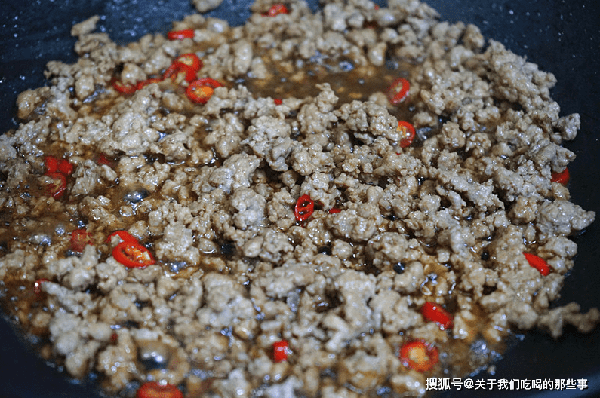 2、起鍋燒油,放入肉末小火翻炒一會兒,顏色金黃後加入生抽、料酒翻炒去腥,放入小米椒炒出香辣味,倒入包菜絲,大火翻炒1分鐘。