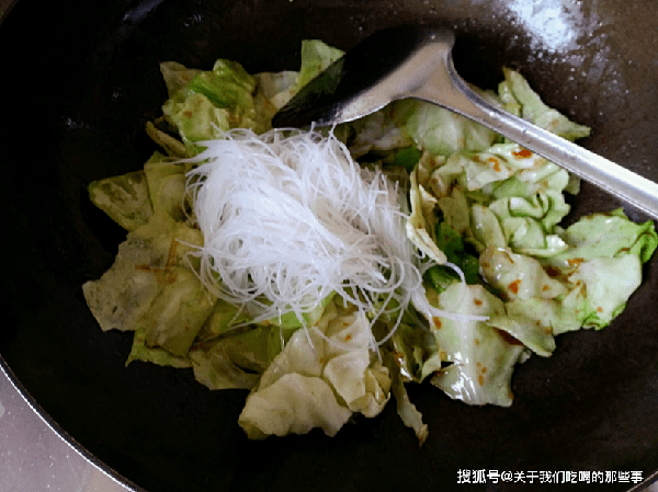3、包菜絲斷生後放入粉絲,加入生抽翻炒上色,最後加入適量食鹽調味,翻炒均勻後撒上蔥花,即可出鍋。