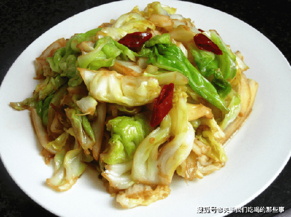 2、起鍋,放入豬油燒熱,下入蔥薑、幹辣椒爆香,倒入包菜葉,大火翻炒2分鐘,微微變軟後放入適量食鹽、生抽、香醋,大火翻炒均勻後即可出鍋。