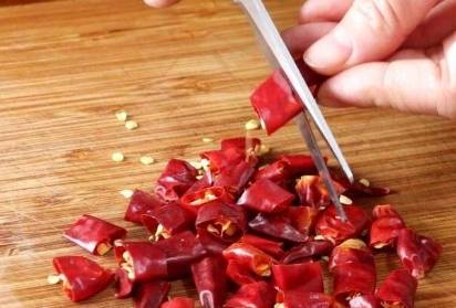 第三步,幹紅辣椒放入在開水中浸泡一會,然後洗凈,切成段,大蒜剝皮後切成片,生薑去皮切成稍微粗一點的絲,大蔥洗凈切成段,在鍋中添上油,待油燒熱後;