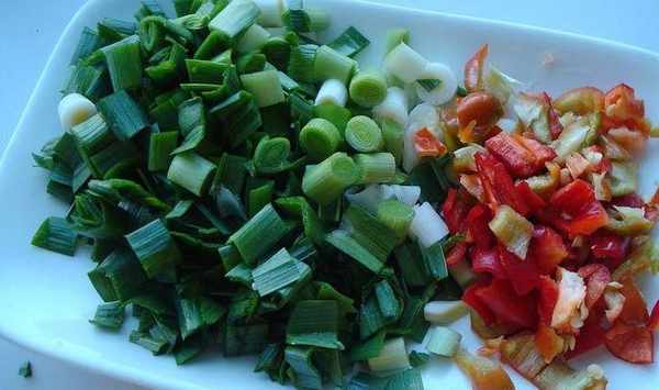 7、加蒜苗、紅辣椒翻炒均勻,加雞精翻炒均勻即可