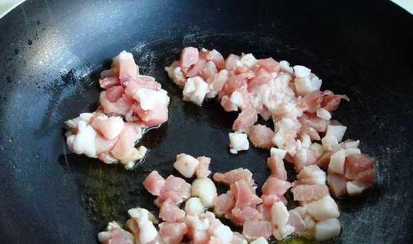 做法:1、把豬肉去皮切小丁,蒜苗洗凈切丁、薑切末