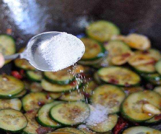 步驟1.先把黃瓜洗幹凈切成薄片,然後加一點鹽放哪醃制一下,大概十分鐘。這個時間可以將尖椒切成小片,大蒜切成小片。