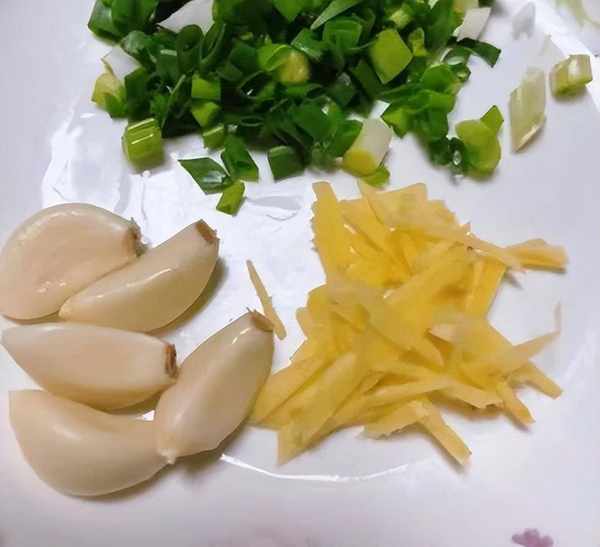 第四步,放入蔥末,薑絲,大蒜瓣,煸炒一下,加入清水燒開。放入適量食鹽,雞精,料酒,小火慢燉25分鐘。