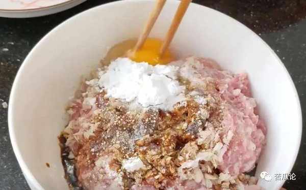 ②接著準備5塊錢的半肥瘦豬肉,剁碎成肉末,放淀粉、雞蛋增加滑嫩感,再放食鹽、胡椒鹽、花生油、生抽、蠔油調味。
