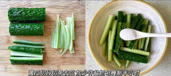 ①準備2根黃瓜,切成兩段,再對半切開,去掉中間的心,然後將黃瓜切成小段。再放點食鹽抓拌幾下,醃制5分鐘。