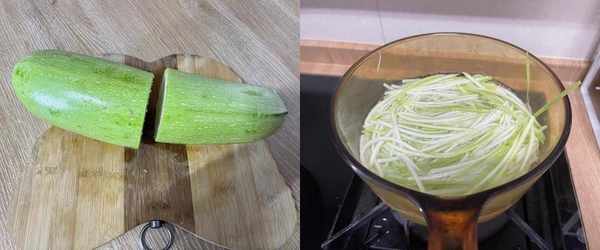 ①西葫蘆洗凈,對半切開,然後切絲備用。燒開熱水,倒入西葫蘆絲,焯水1分鐘撈起。