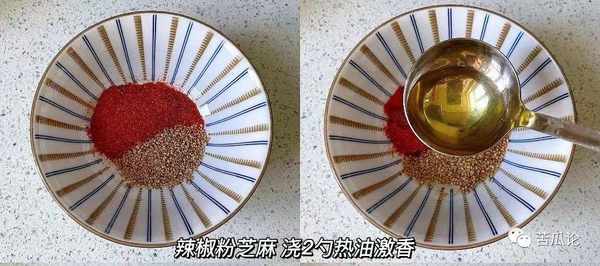 ③接著在碗中放芝麻、辣椒粉,倒入熱油激發香味。隨後放生抽、老抽、砂糖、食鹽調味料汁。
