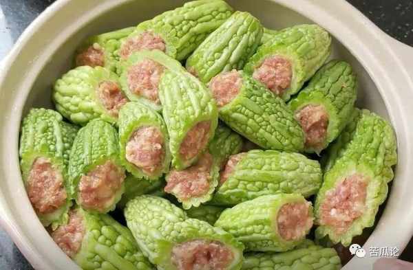 ③攪拌好的肉末,塞入苦瓜中。塞好的苦瓜釀肉,放在鍋中,再倒入兩碗清水,連續燉10分鐘即可。
