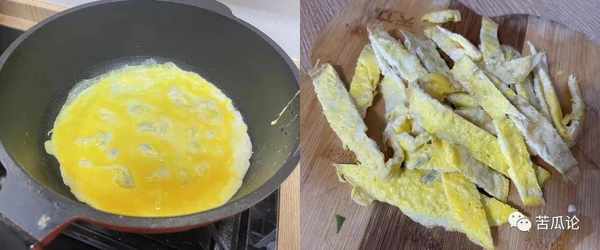 ②接著準備2個雞蛋,打散放在碗中,倒入鍋中,煎成蛋皮,再將蛋皮切絲。