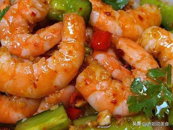 準備食材:蝦仁,黃瓜,小米辣,蒜末,香菜,辣椒面。