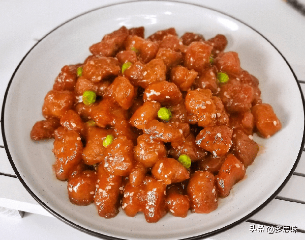 4、糖醋汁倒入鍋中,燒汁濃稠倒入炸好的肉塊,加白芝麻,熟豌豆快速翻炒均勻。